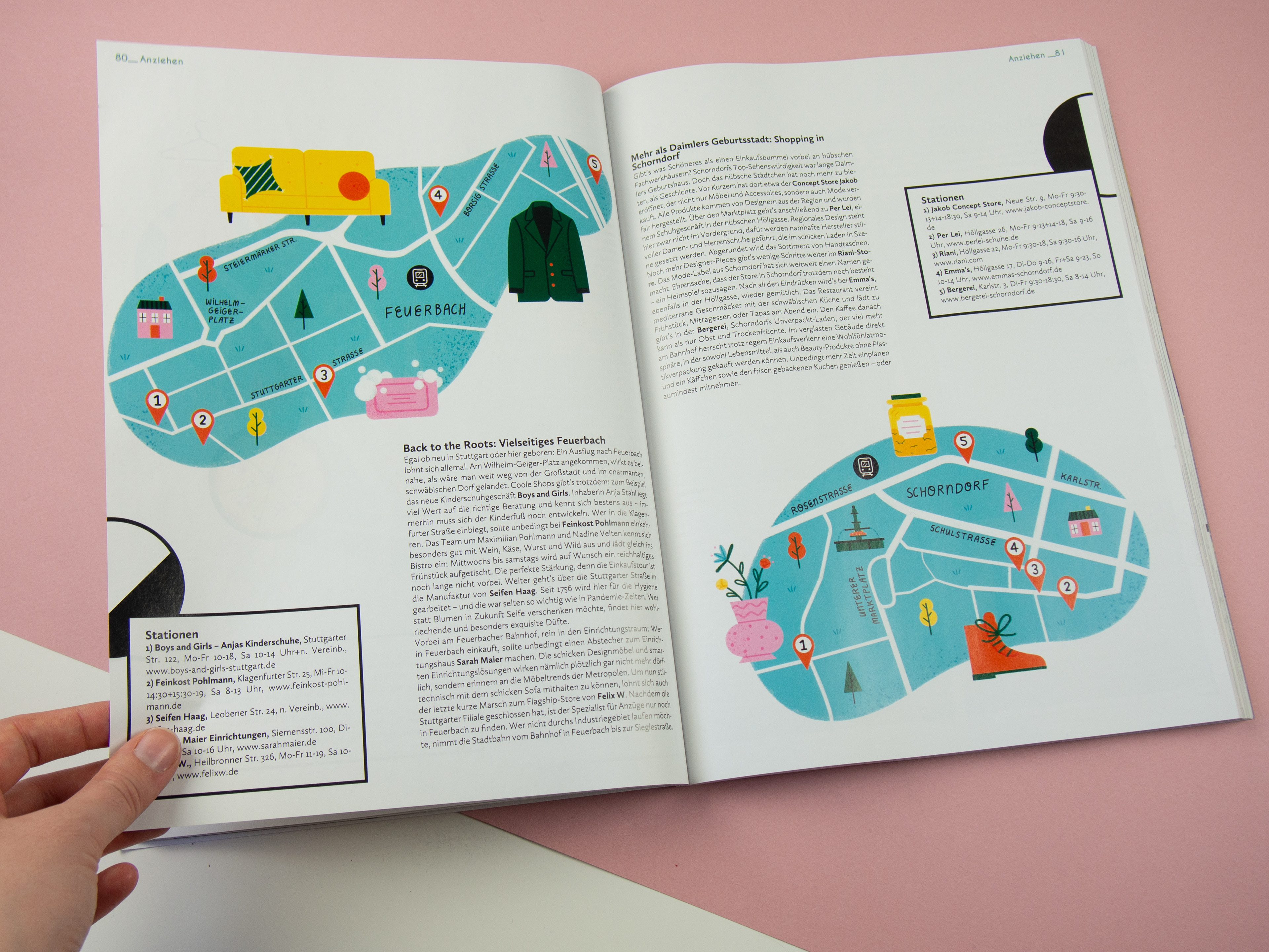 The maps show shopping tips for different districts in Stuttgart and Schorndorf.